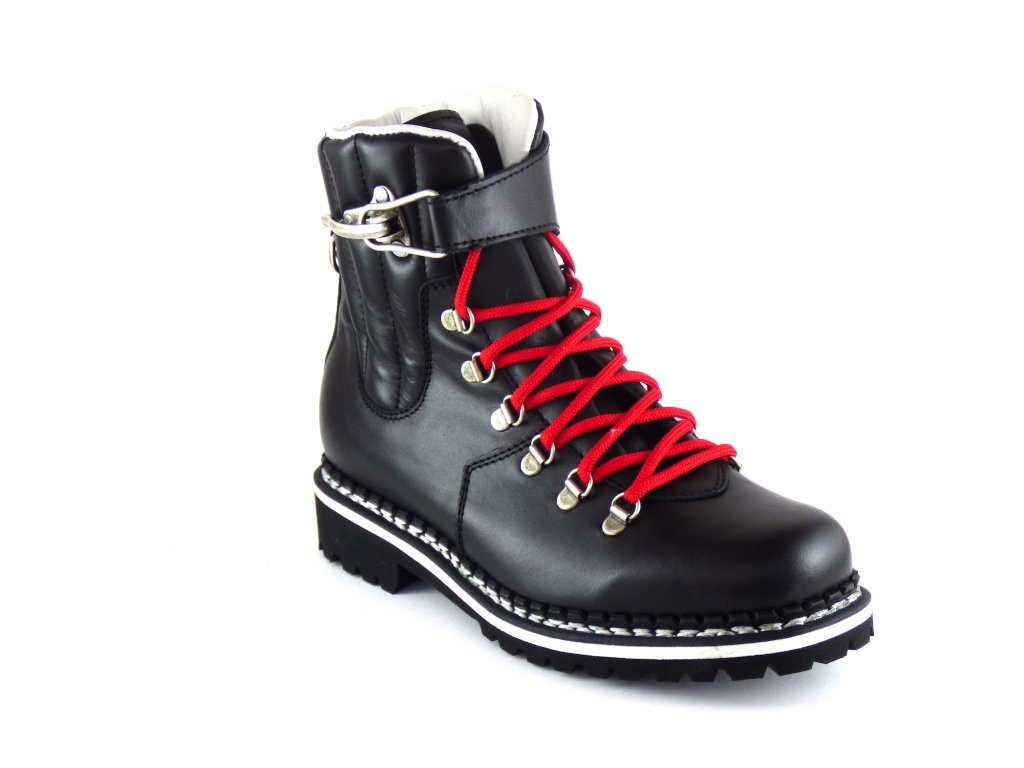 Vyšší kotníčková ručně šitá italská obuv s tradiční ozdobnou přezkou. Originální styl obuvi tvoří především norský rám, tedy způsob připevnění horní části obuvi k podešvi s použitím lemu a dvou viditelných okrajů stehu. Jedná se o ručně vytvořený proces, který je navržen tak, aby izoloval nohu a současně nabízel flexibilitu a pohodlí. Plných 5 vrstev podrážky izoluje nohu od země: anatomická stélka z kůže, tužší deska z pravé kůže, lehká EVA pěna, která slouží jako tlumič nárazů, středová výztuha v EVA s dalšími tlumícími vlastnostmi a kvalitní protiskluzovou podešev.