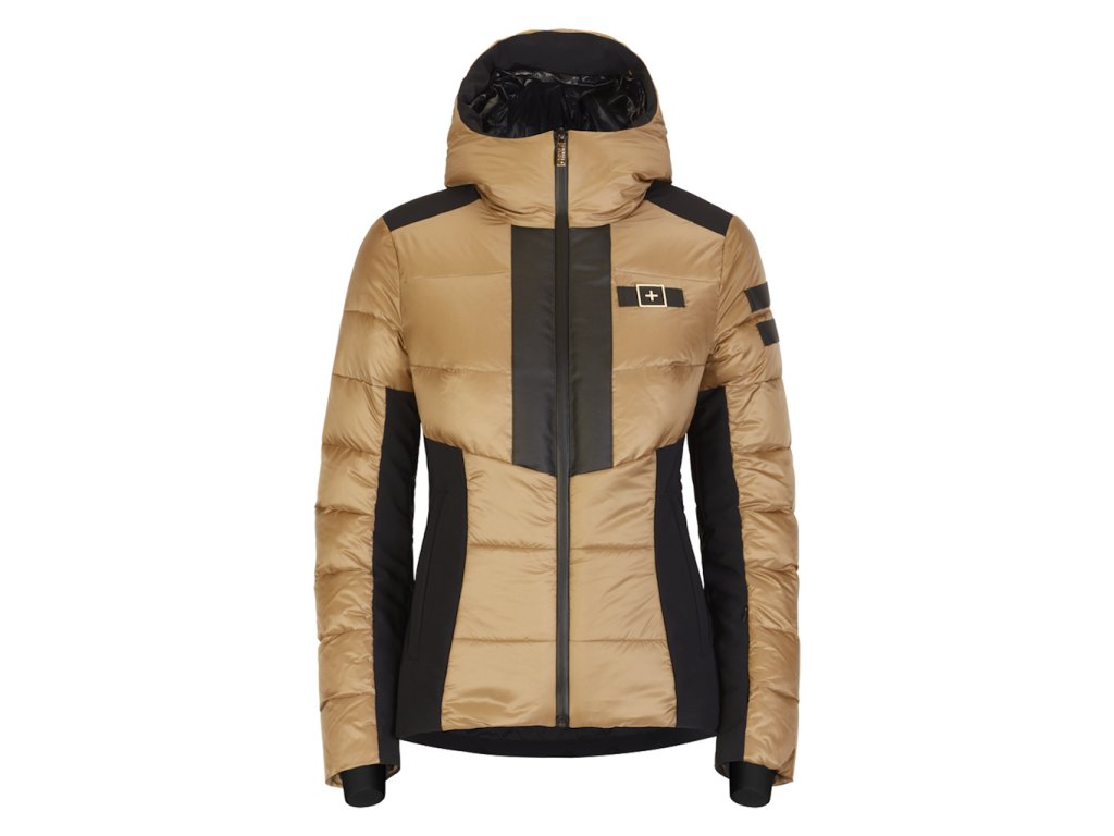 Prémiová dámská lyžařská bunda ve zlatohnědé barvě s moderním designem, vysokou funkčností a luxusními materiály.