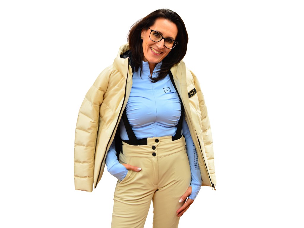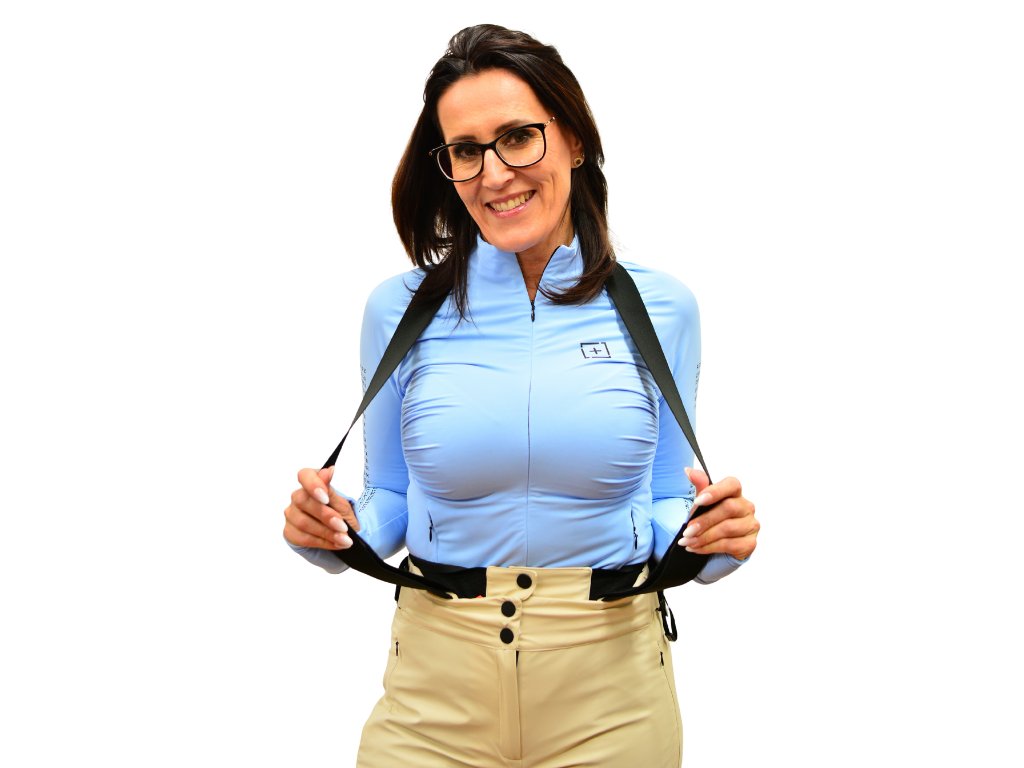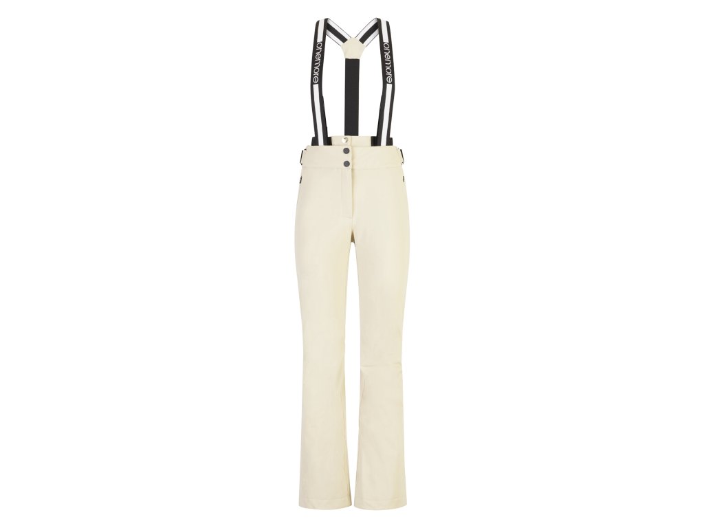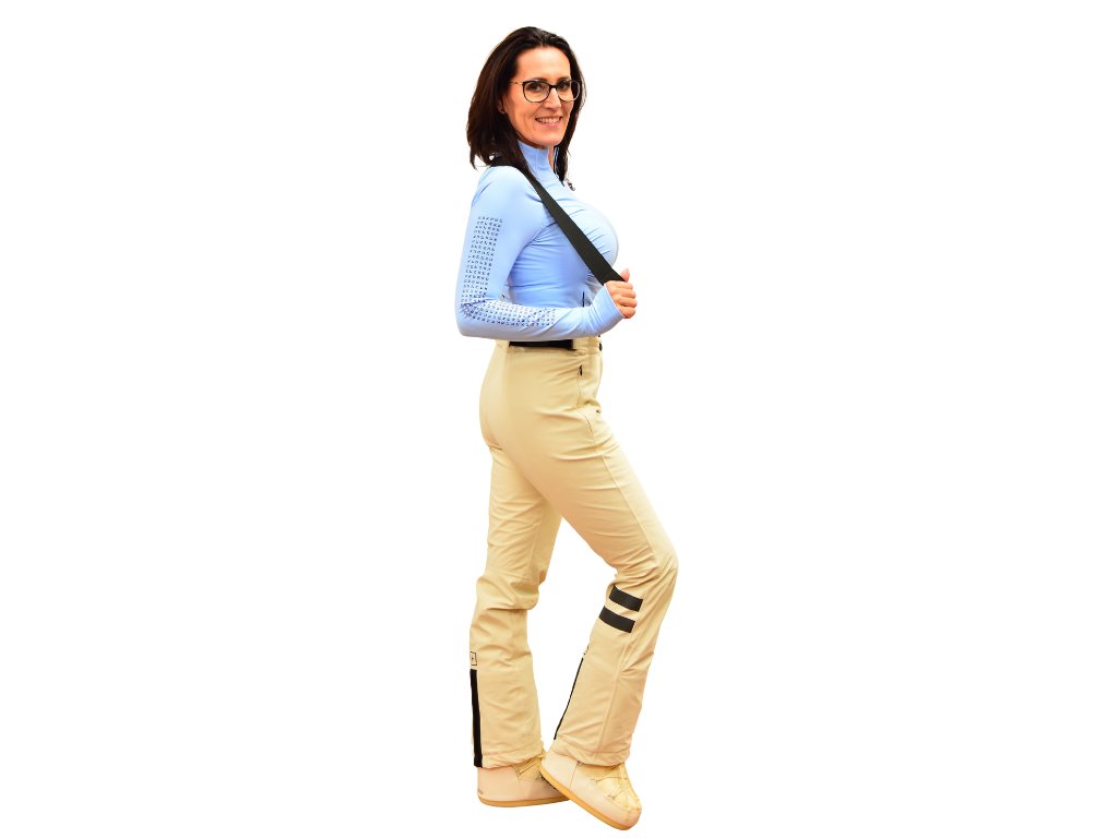 Dámské lehké technické lyžařské kalhoty ze 4směrné strečové tkaniny s odnímatelnými šlemi a vysokým komfortním pasem.