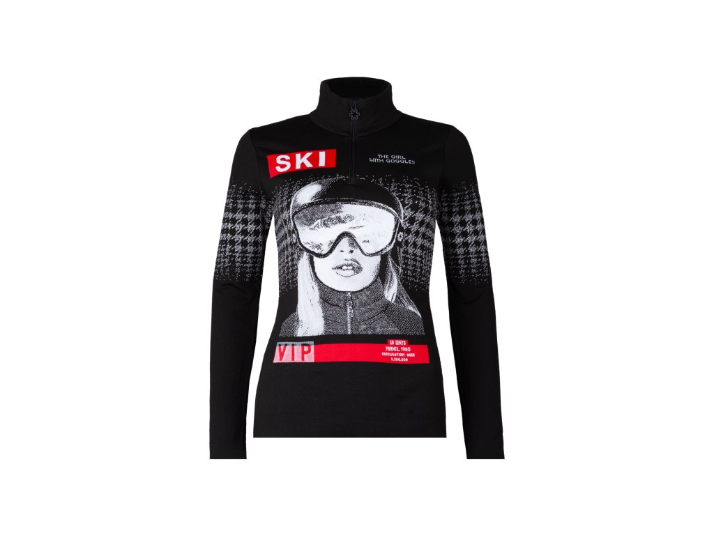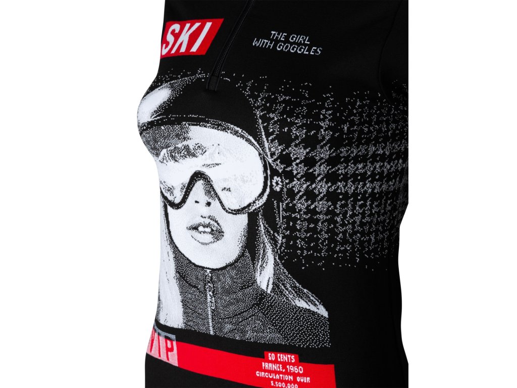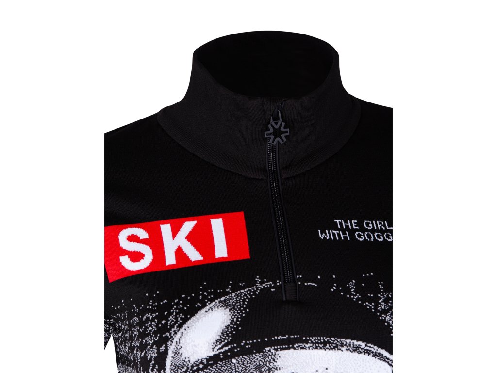 Technický a stylový dámský half zip svetr z rychleschnoucího DHtech 400 materiálu s unikátním vintage SKI VIP jacquard vzorem, ideální pro zimní sporty i volný čas.