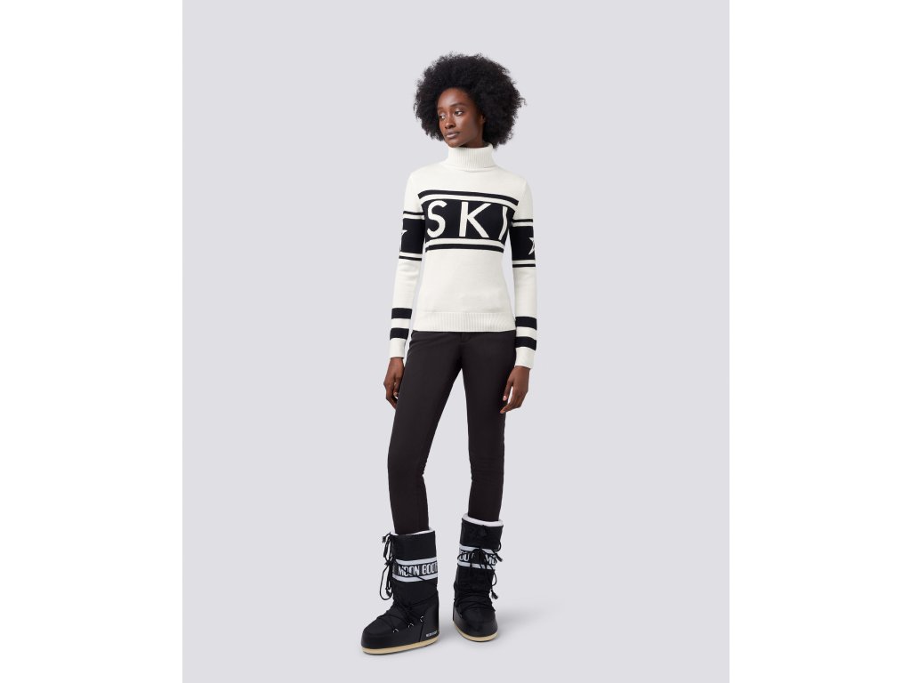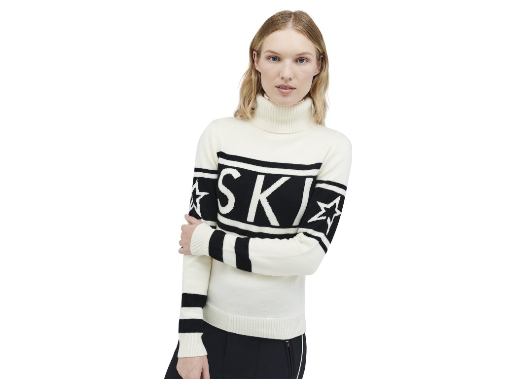 Vlastnosti: | • Vypasované s délkou na boky • Rolák • Dlouhé rukávy s žebrovanými manžetami • Žebrovaný lem • „SKI“ intarziová pletenina uprostřed přední části |