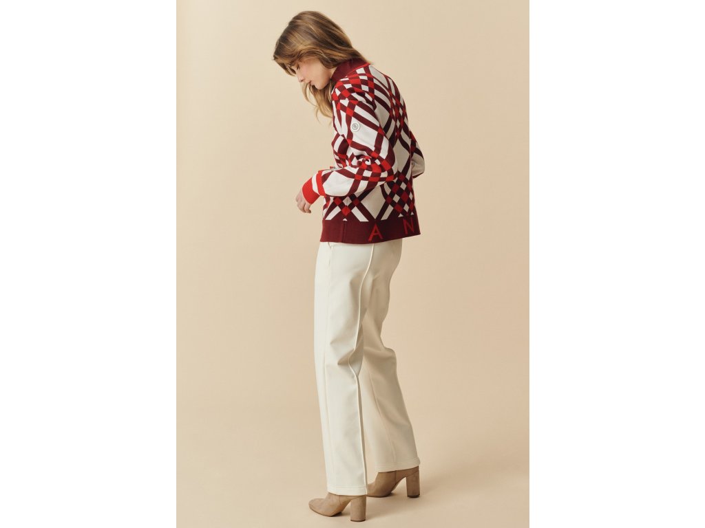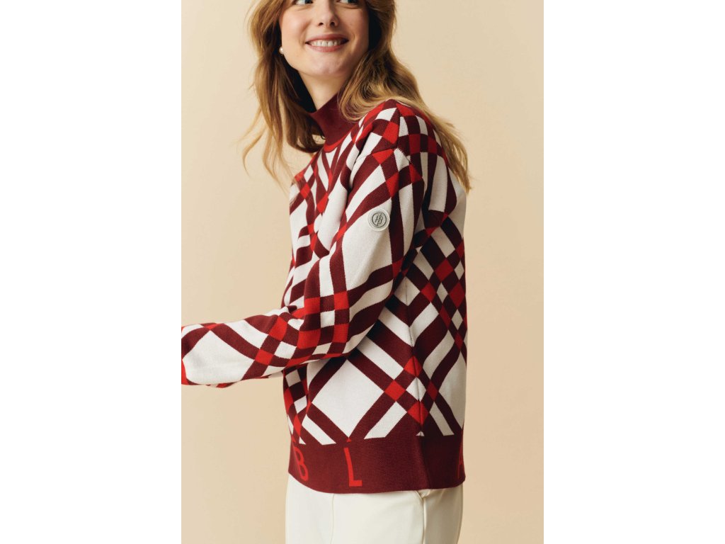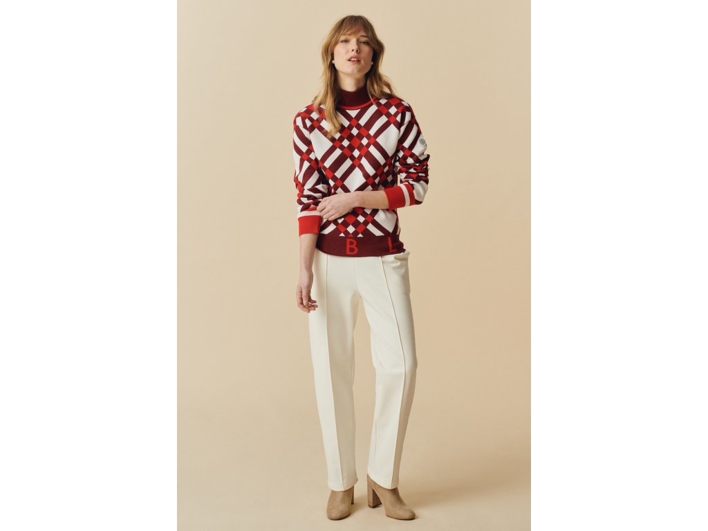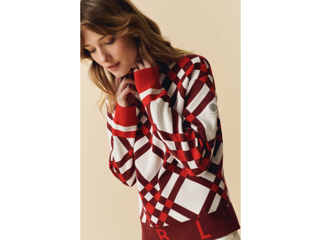 Dámský pleteninový svetr se stojáčkem v barvách jemné červené a bordo POIVRE BLANC W24-3553-WO KNIT PULLOVER s křížovým kostkovaným žakárem je vyroben z příjemné na dotek hedvábné tkaniny.
