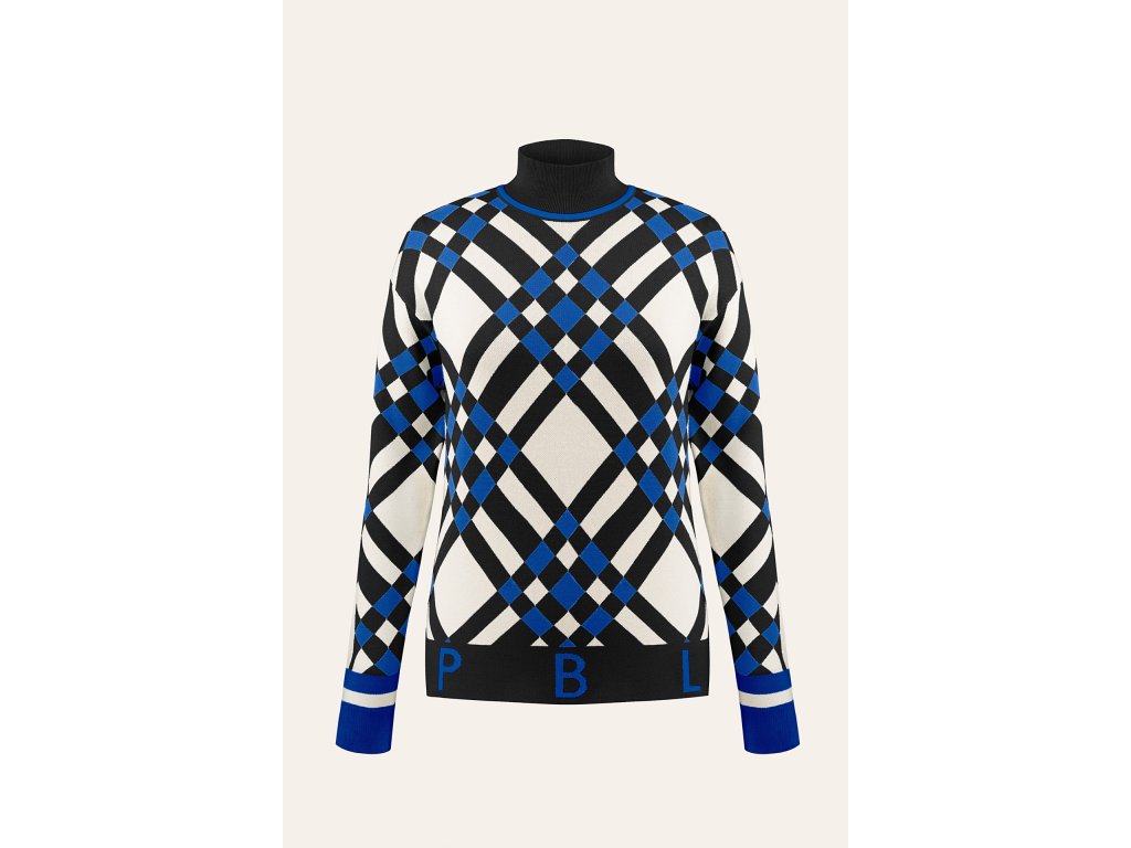 Dívčí pleteninový svetr se stojáčkem jasné modré a černé POIVRE BLANC W24-3553-JRGL KNIT PULLOVER s křížovým kostkovaným žakárem je vyroben z příjemné na dotek hedvábné tkaniny.