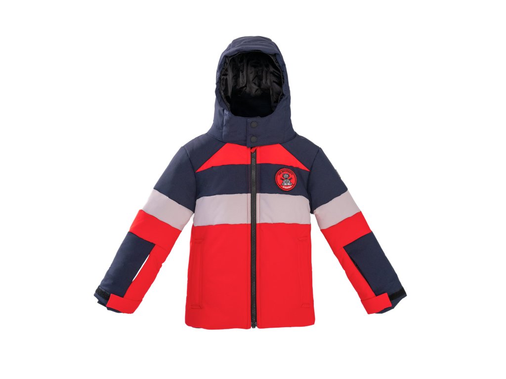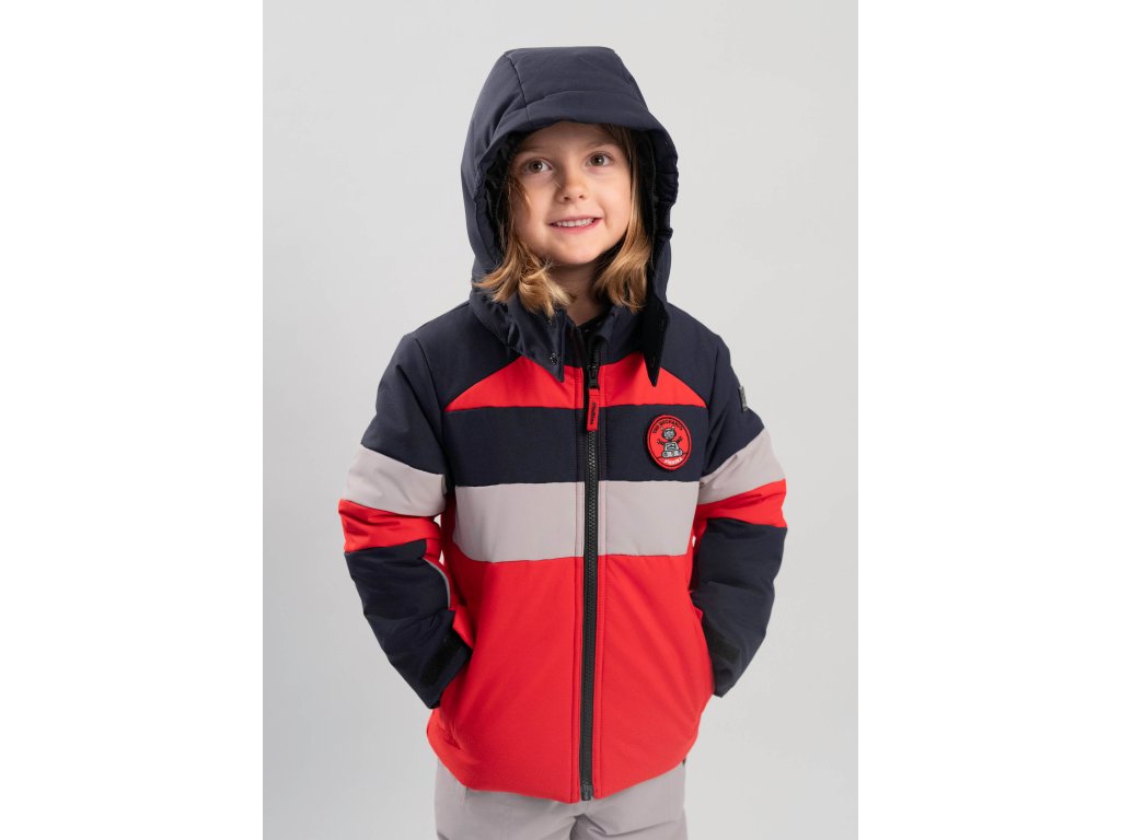 Technická lyžařská bunda pro děti s výrazným designem, funkční výbavou a důrazem na pohodlí i bezpečnost při zimních aktivitách.