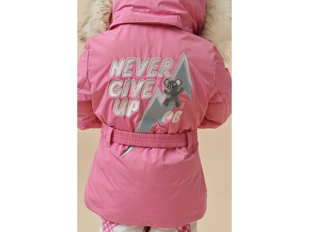 Důraz byl jako vždy kladen na estecké detaily jako je odepínací pásek se zrcadlovou sponou, metalické YKK zipy s logem a nebo detailně zpracovaná výšivka na zádech NEVER GIVE UP (nikdy to nevzdávej). Kapsy na ruce jsou na zip a samozřejmě nechybí kapsa na skipas. Kapuce je odepínací a nastavitelná s odnímatelnou bohatou syntetickou kožešinou.