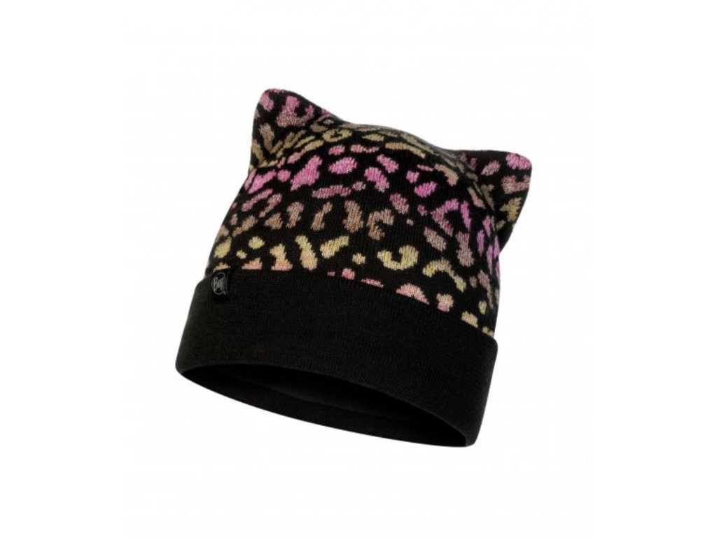 Dětská čepice BUFF JR KNITTED AND POLAR HAT ALISA BLACK s fleecovou vsadkou, leopardím vzorem a kočičíma ušima.