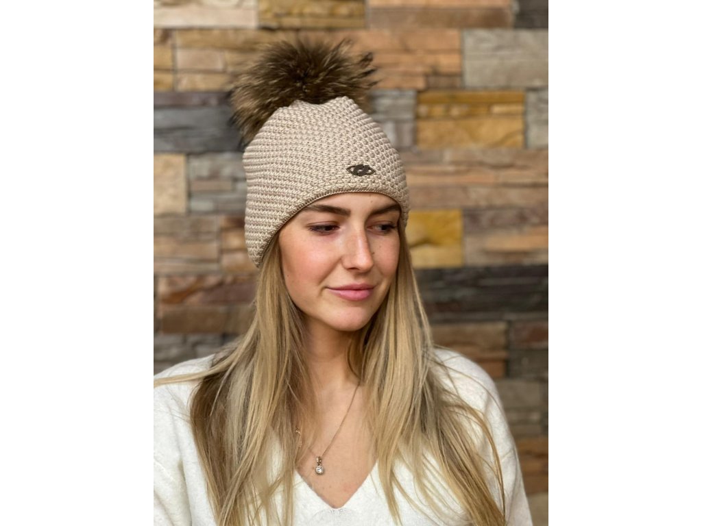 R-Jet čepice je zdobená decentním kovovým logem, pravou kožešinovou odepínací bambulí.