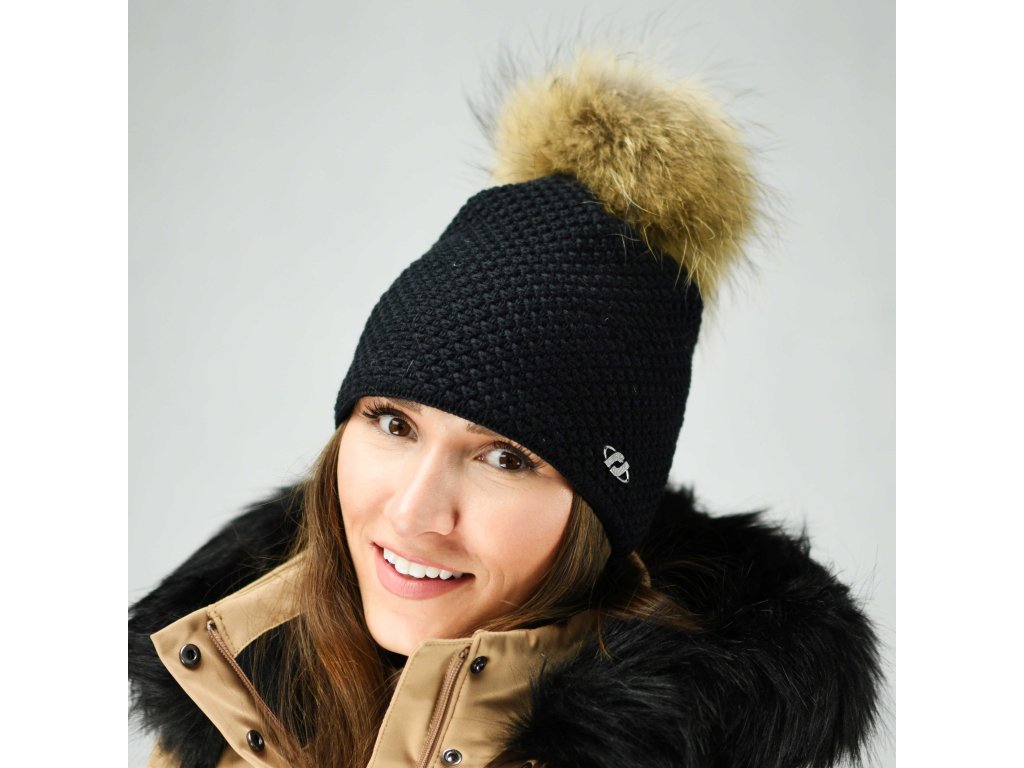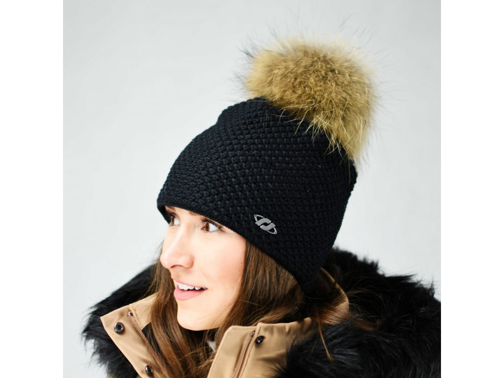 R-Jet čepice je zdobená decentním kovovým logem, pravou kožešinovou odepínací bambulí.