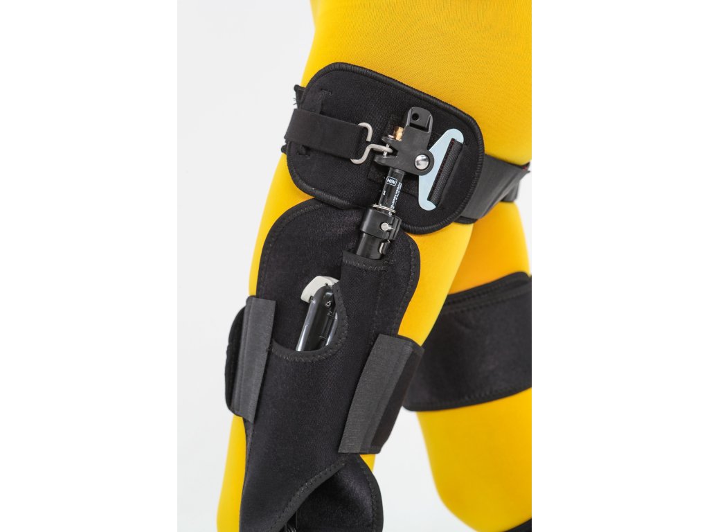 Nejde o ortézu ani dlahu, ale o mechanický exoskelet, který pomáhá odlehčit nohám, kloubům i zádům během jízdy na svahu.