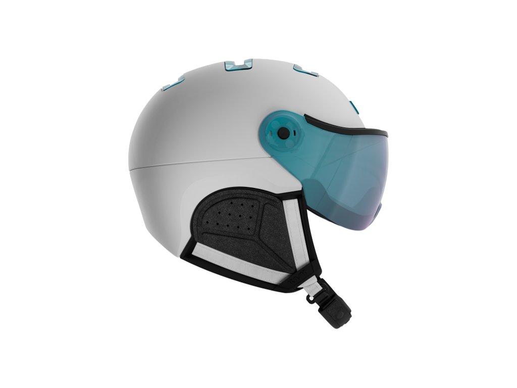 Elegantní bílá helma s chromovými detaily a tyrkysově zrcadlovým štítem zaujme nejen svým moderním vzhledem, ale i špičkovými technologiemi.
