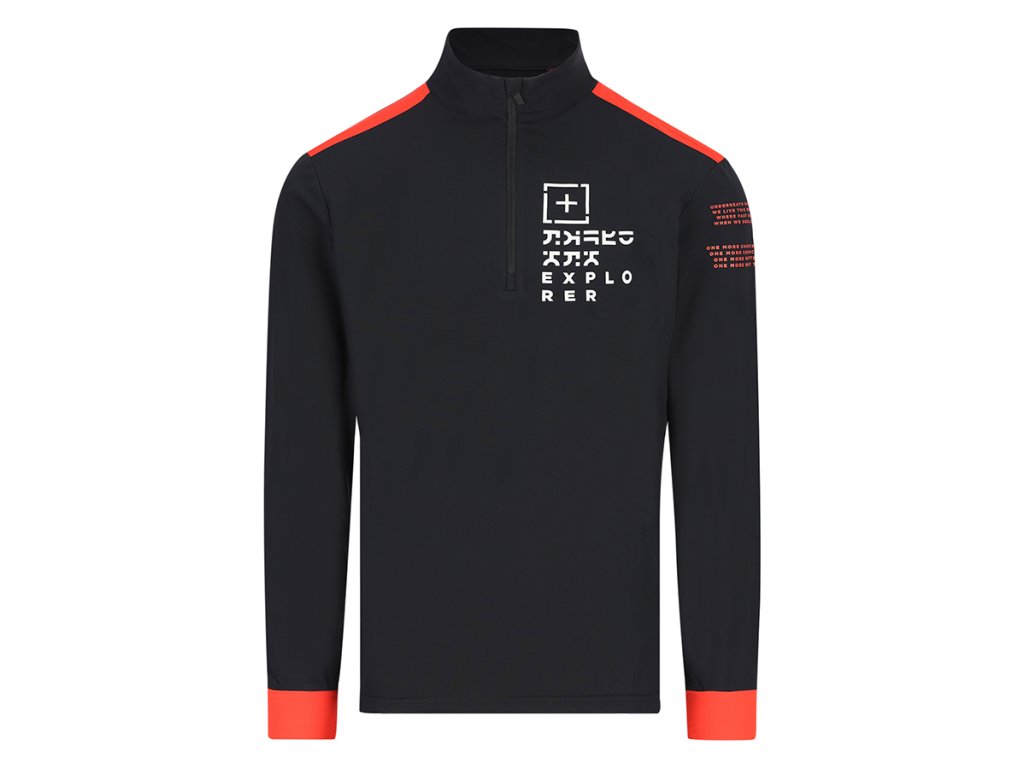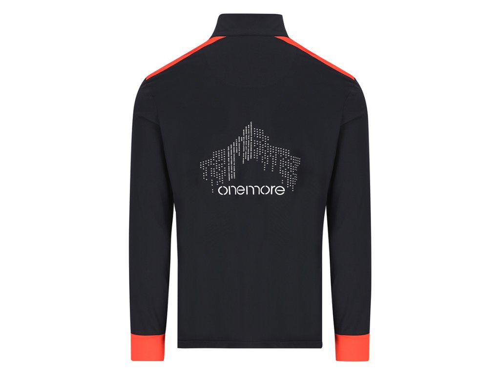 Základní černý tón doplňují kontrastní detaily v sytě červené (Bacio) a elegantní bílé akcenty, které dodávají dynamiku. Materiál z regenerovaného mikrovlákna ECONYL® je lehký, pružný, rychleschnoucí a šetrný k přírodě. Přiléhavý střih zajišťuje optimální komfort, efektivní odvod vlhkosti a volnost pohybu. Poloviční YKK zip umožňuje snadné oblékání a ventilaci, reflexní logo OneMore podtrhuje sportovní charakter.