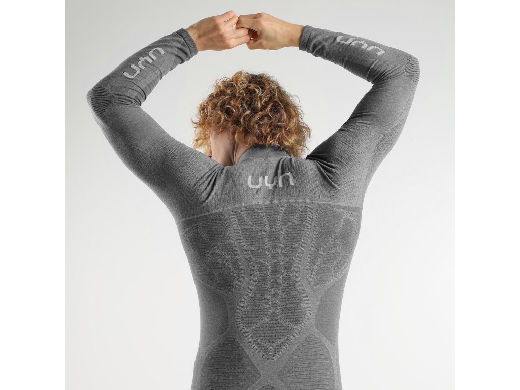 Multifunkční základní vrstva v šedém melíru, která propojuje moderní design s precizní zónovou architekturou a biologickým původem vláken.